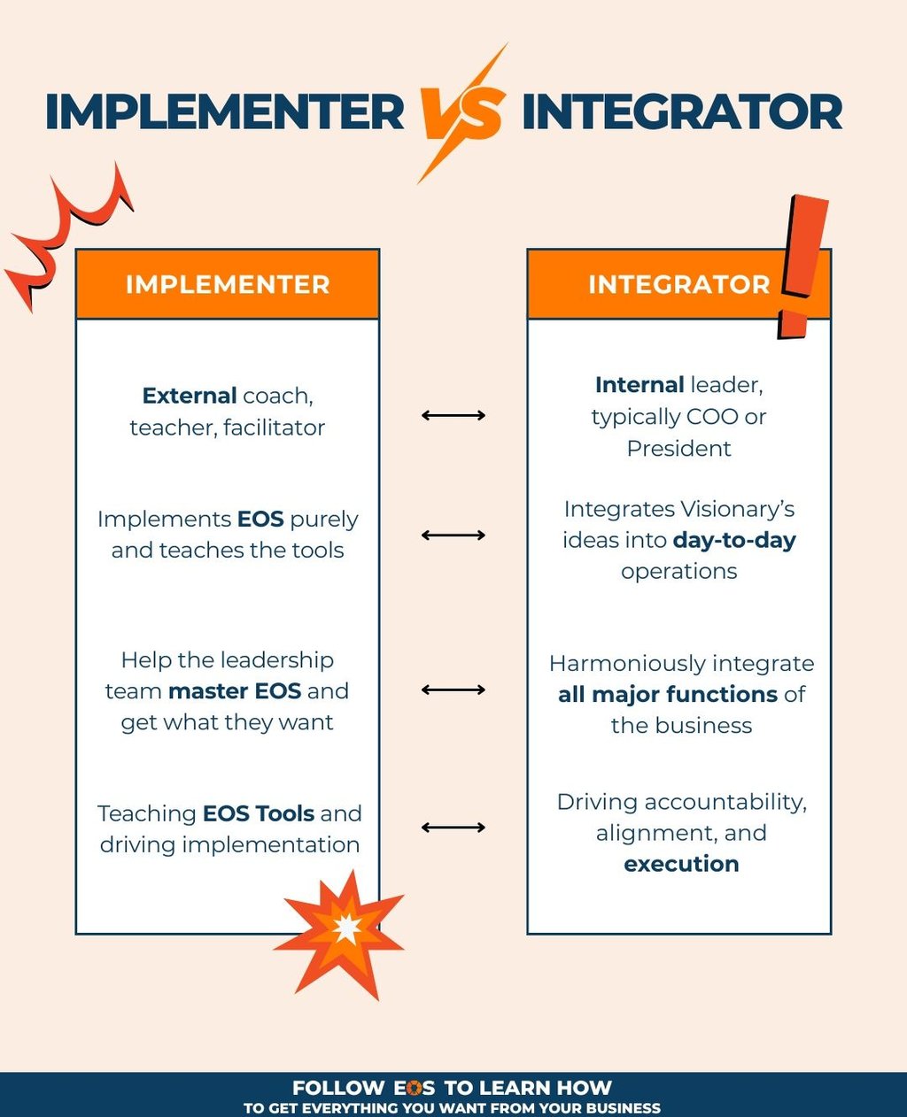 I get this question all the time. This is a really helpful breakdown from EOS Worldwide on the difference between an Integrator and an Implementer. Understanding how these two roles work together is key.